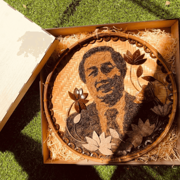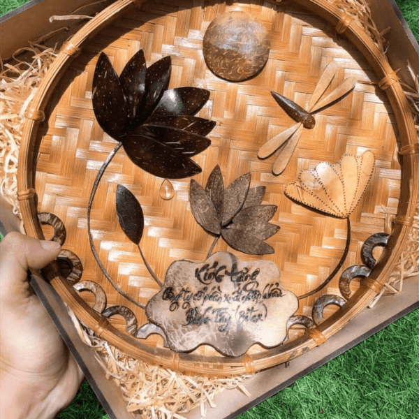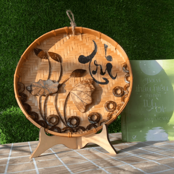 Tranh gáo dừa ốp mẹt tre đề thư pháp